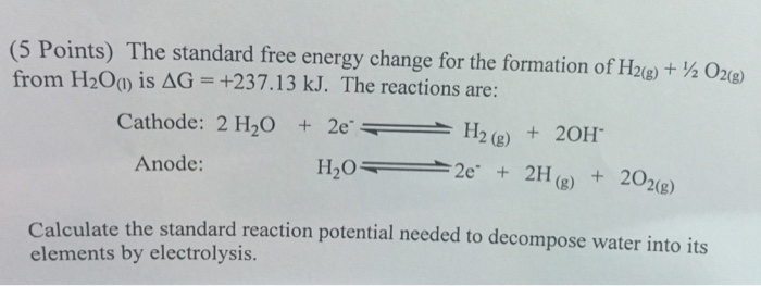Check to make sure the equation is balanced Look up the Standard Free Energy of Formation of H2O g and multiply by its coefficient 2 in the equation. One mole of Cl 2 gas at 29815 K for example has Δ G f 0. Delta G Delta Go RT ln Q label110 Delta G free energy at any moment Delta Go standard-state free energy.